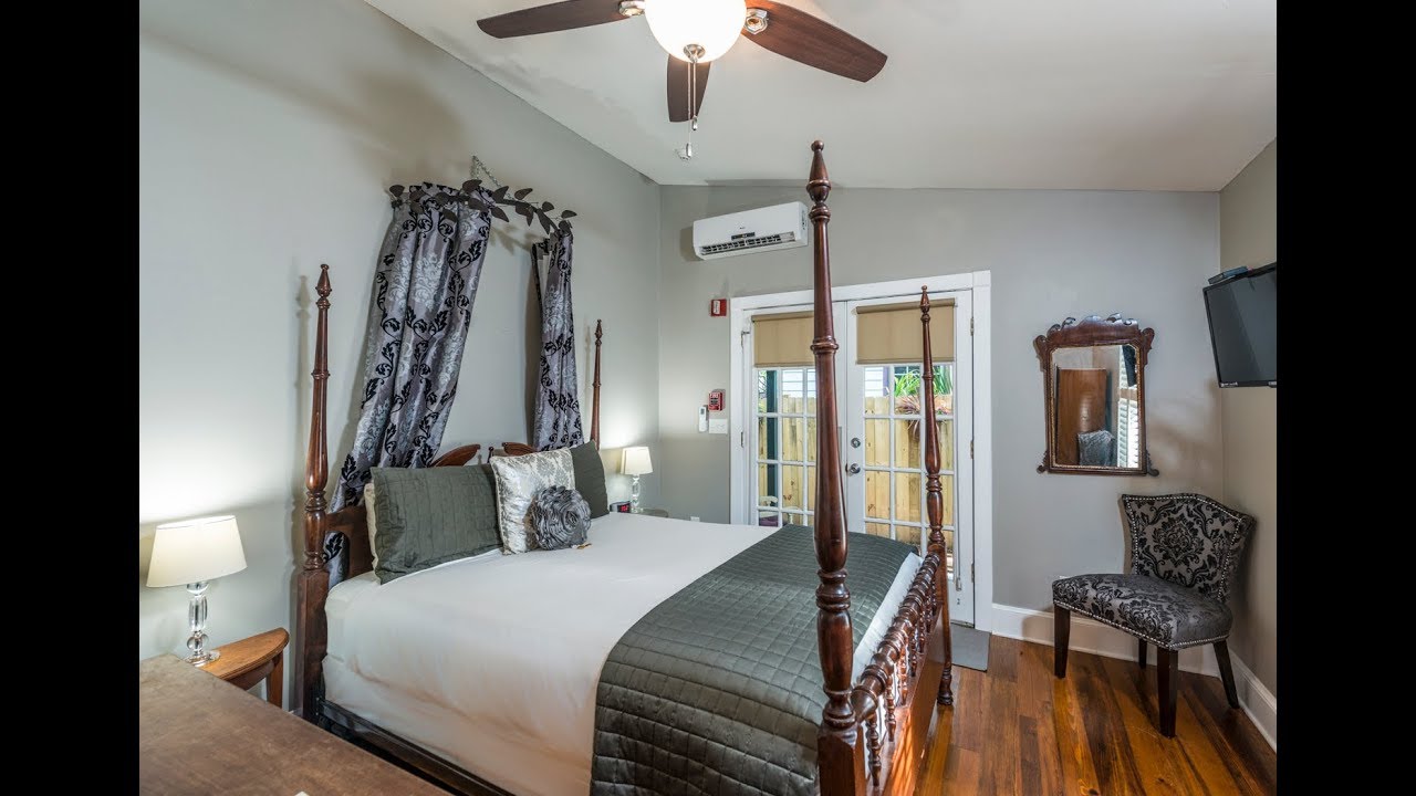 | Queen four poster bed | Ground floor in the private Cottage | Victorian subway tile rainhead shower with body sprays | Individually controlled HVAC | Private courtyard | Size including bath - 218 sq ft |